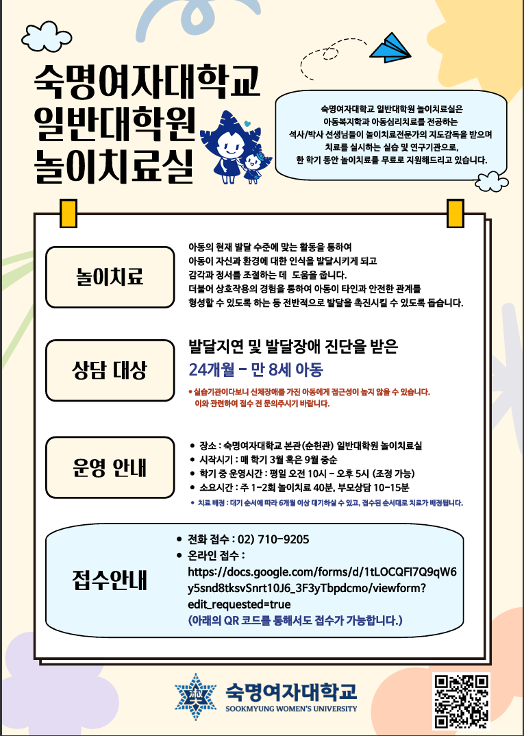 [숙명여자대학교 일반대학원 놀이치료실] 놀이치료 내담자 모집 안내