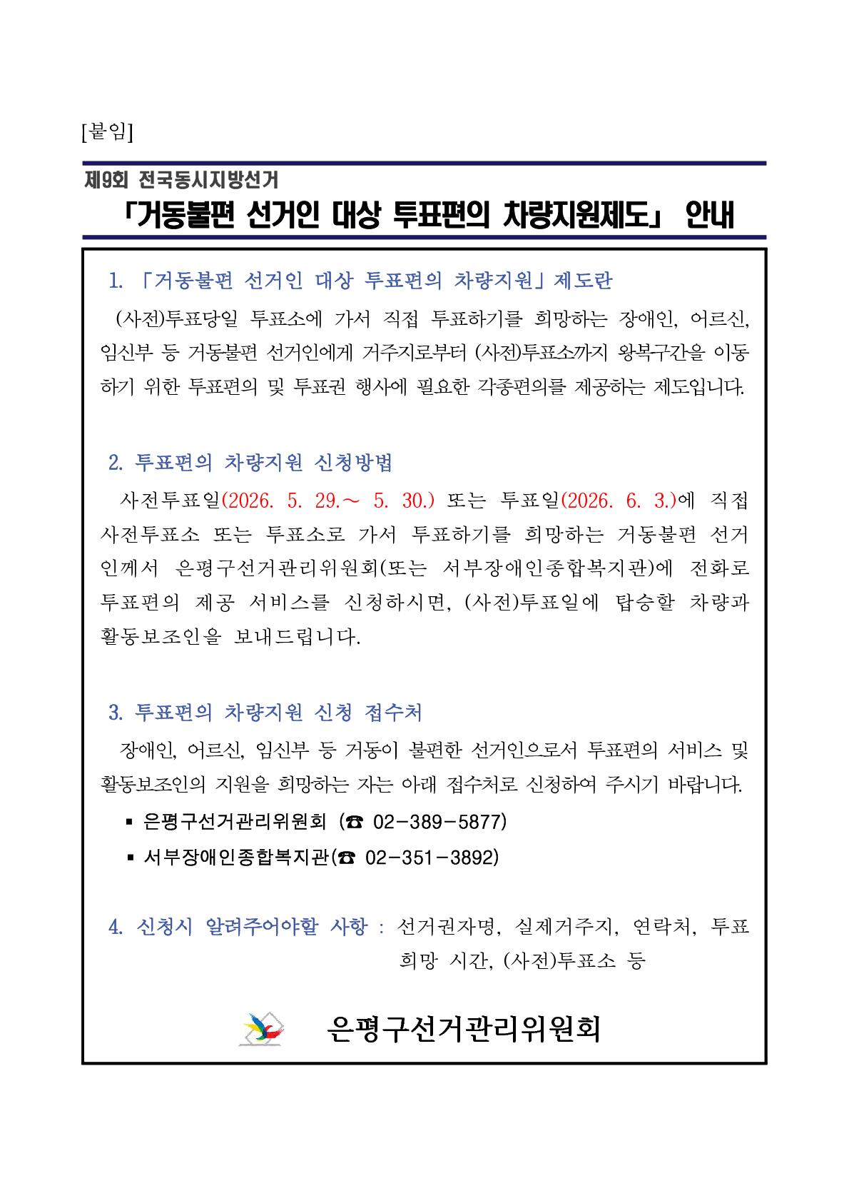 제9회 전국동시지방선거 「거동불편 선거인 투표편의 차량 지원」 안내